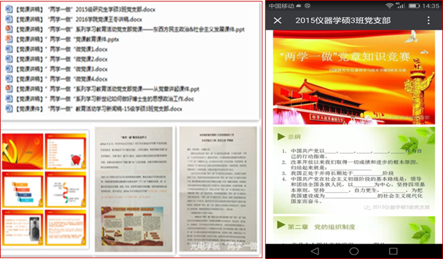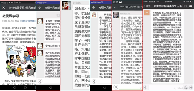 学生党支部还充分利用新媒体,建立微党课、支部微信公众号,关注“人民日报评论”、“镜鉴”、“共产党员”等微信公众号,拓展学习资源,分享学习收获,在相互交流和激励中提升了“两学一做”学习教育的效果。