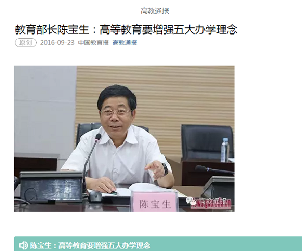 【学习园地】教育部长陈宝生:高等教育要增强五大办学理念