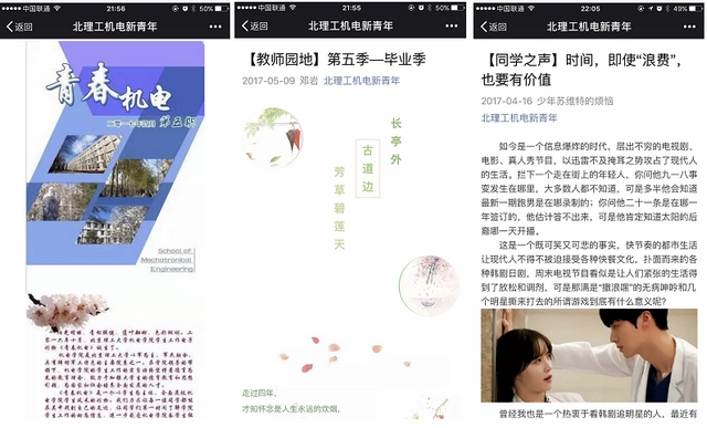 机电学院团委依托“机电新青年”微信公众号开展思想引领。先后推出“青春榜样”系列文章,分享优秀学子成长成才经历,让团员青年时刻接受思想信仰教育,学习榜样,坚定信仰;坚持每月推送教师园地系列文章,拓宽了机电学院师生之间相互了解、平等交流的渠道,彰显青年教师思想风貌,展现青春风采、倡导人文情怀、把握时代脉搏,引领青年团员健康的思想动向;每月一期“青春机电”电子刊物以新颖的形式,按月对学院动态进行跟踪、报导和总结,记录机电学院各大新闻,彰显青春风貌,服务全院师生,积极宣扬健康、向上、和谐的校园生活。 与此同时,机电学院团委创新工作方法,推出“青年节日说”系列活动,依托植树节、清明节、端午节、重阳节等传统节日及五四运动、七一党的生日等纪念日开展线上线下相结合的寄语征集活动,充分利用新媒体弘扬传统文化、传播正能量。