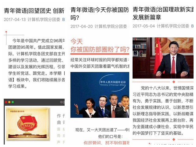 为扩大主题教育活动影响范围,计算机学院在原有基础上继续加强网络思政平台建设。本学期工作中,为推动宣传工作接地气,计算机学院在学生中遴选了一批青年评论员,通过简明的语言普及党的十八大以来我国的社会经济发展、时政热点、党史团史等理论知识,在学生群体中反响良好。截止至今,计算机学院共利用BITCS微信公众号发布青年学习评论文章7篇,累积点击量千余次。