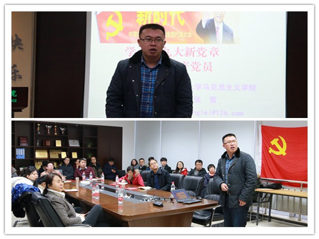 受聘仪式结束以后,马克思主义学院张雷老说带领师生学习新党章。张雷从党章的概述、历届党章回顾、学习十九大新党章、做合格共产党员等四个方面,为生命学院师生党员上了一场生动的党课。他说:“党章的学习要内化于心,外化于形。形式上入党一生一次,思想上入党一生一世。”