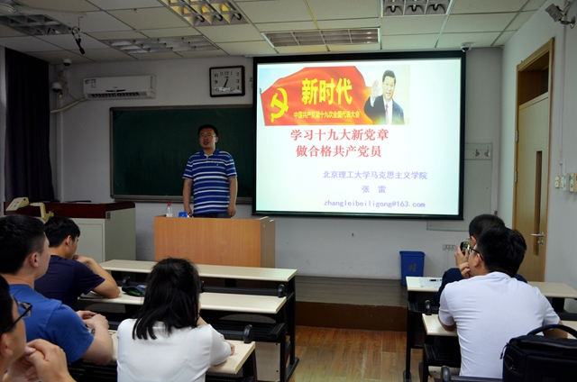 张雷带领同学们深入学习了十九大新修订的党章,并回顾了从中共一大到中共十九大党章的每一次修订,深入地分析了每个时期党章的变化。他还给同学们分享了自己学习党章、学习理论知识的方法,用“组织上入党一生一次,思想上入党一生一世”勉励同学们,不断武装思想,坚定信念,做时代新人。
