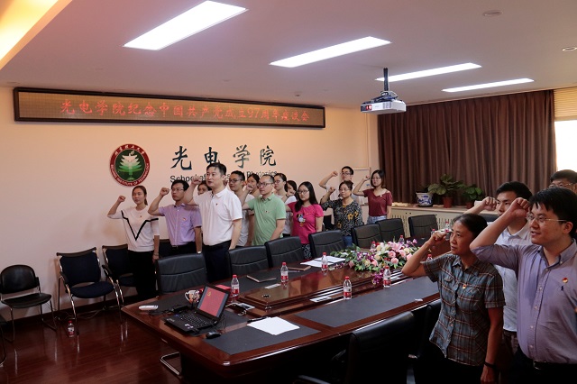 6月28日上午,光电学院在信息教学楼2023会议室召开纪念中国共产党成立97周年座谈会,学院领导、党支部书记和师生代表参加了谈会。会议由学院党委副书记、副院长盛筠主持。会议开始,全体人员重温了入党誓词。
