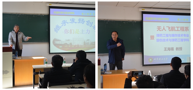随后,同学们在3号教学楼402教室开展了讨论交流。王海福教授为大家详细地介绍了无人飞航工程系的发展历史、专业特色以及校友之窗,同时他鼓励同学们继承老一辈传统,发扬新时代创新精神,争做国防领军人才。冯顺山教授用矛和盾的关系,向大家介绍了毁伤的发展和变革之路,同时祝愿同学们积极进取,勇于开拓。王伟提出,作为传承红色基因的北理学子,更应将个人发展与国家大政方针结合起来,拥有家国情怀,担当时代重任,勤奋努力,把弘扬爱国奋斗精神落实到日常的学习生活中。