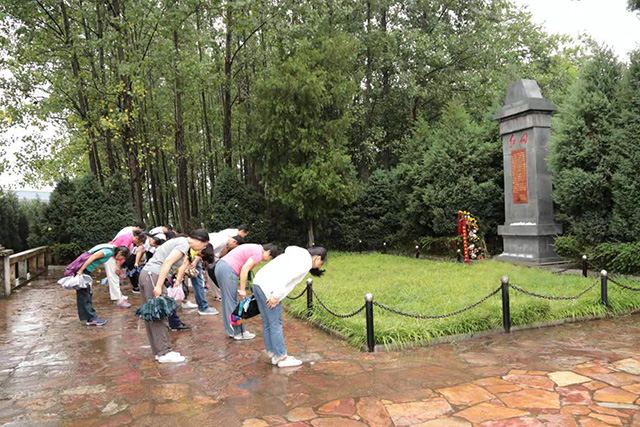 在红四方面军将士纪念馆、鄂豫皖苏区将帅馆和”红田惨案”遗址,庄严肃穆的松柏伴随着小雨,仿佛诉说着革命先辈抛头颅洒热血的点点滴滴。教师们无不被革命先烈英勇顽强、视死如归的革命精神深深感染,自发地合上雨伞鞠躬缅怀。