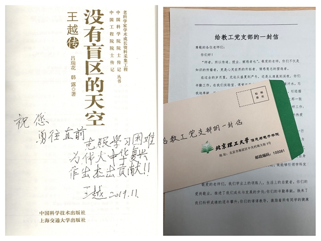 移步党建工作室后,开启了共建研讨环节。运用跨校区远程视频会议系统,实现了在中关村校区信息安全与对抗研究所教工党支部、信息安全与对抗研究生第三党支部与在良乡得睿信书院本科生党支部3个支部实时互动。活动中,党建导师代表陶然、单涛,学生党员代表周雨潺、王洋、杨传敏、毛著章分别结合各自工作和学习,围绕“爱国奋斗”主题,交流分享感悟和心得。学生代表致信党建导师表达感恩。活动中,参观展览环节讲到的王越院士作为学院第一批党建导师代表,向学生支部赠书,书上亲笔提写“祝愿勇往直前,克服学习困难,为伟大中华复兴作出杰出贡献!”勉励学生爱国奋斗。