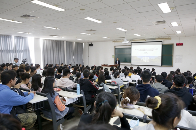 秋高气爽,叠翠流金。在德赢AC米兰官网良乡校区理科教学楼401教室里,赵长禄正在为来自2020级精工书院、明德书院和睿信书院的236名新生讲授“习近平新时代中国特色社会主义思想概论”第一课——《以习近平新时代中国特色社会主义思想为指引 做担当民族复兴大任的时代新人》。赵长禄用宽广的视野、丰厚的知识、风趣的语言,以习近平新时代中国特色社会主义思想为主线,分别从“中国特色社会主义进入新时代,党和国家重大战略部署”“国内外环境发生深刻变化,我国经济社会发展的新形势”“贯彻落实‘四为方针’,北理工的历史使命”“实现中华民族伟大复兴,青年学生的时代担当”四部分进行授课。课堂上,同学们认真聆听、用心领悟,课堂氛围温馨而活泼。
