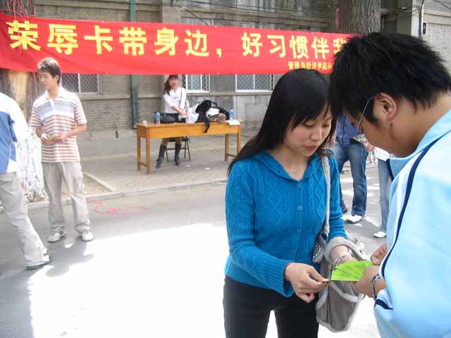 活动当天,管理与经济学院共产主义学习会的干事们耐心地向过往的同学介绍“荣辱卡”的意义和作用,青苹果绿色的卡片为同学们带去了春天的清新和温暖,活动开始不久就有不少同学纷纷来到活动咨询处索要卡片、向干事们咨询活动事宜。许多学校的退休老教师和教工家属也闻讯来到活动现场,纷纷表示这种赠送“荣辱卡”的活动是及时的,是贴心的。一位老教师表示他将珍藏这张带着学生们满满情谊的“荣辱卡”。老教师们真挚的肯定感动了现场的每一位同学,也使管理与经济学院共产主义学习会的干事们受到了鼓舞,充满了干劲。“荣辱卡带身边,好习惯伴我行”活动为管理与经济学院共产主义学习会的系列活动开了一个好头,小小的“荣辱卡”将作为北理学子以八荣八耻为标准在实践生活中规范自身言行的见证,为校园带来初春的暖意。
