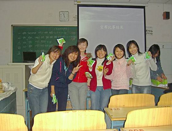 08210401班团支部举行了趣味十足的长征知识竞赛活动。图为获胜队高兴的获得奖品