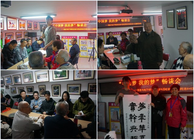 为了增进在思想上的交流,10月23日,双方党支部组织开展了“中国梦·我的梦”畅谈会,就对“中国梦”的认识和如何在平时生活中践行“中国梦”进行了深入交流。畅谈会上,社区党支部的长者们结合“中国梦”向第二党支部的大学生们讲述了年轻时的故事,分享人生感悟,并提出了“修身、务实、走群众路线”的殷切期望。曹华老同志还现场填词一首《相见欢》:“今又讲台教楼,岁月悠,借得长案,相对话题稠。青春灿,斗志焕,即出手。国富民强,梦圆凭劲头。”关老同志更是现场演唱了《我和我的祖国》。畅谈会结束后,社区党支部的老同志们还赠以“梦牵华夏,实干兴邦”、“大展宏图”等多幅书法作品,以此表达对大学生党员的勉励与希冀之情。![]()
