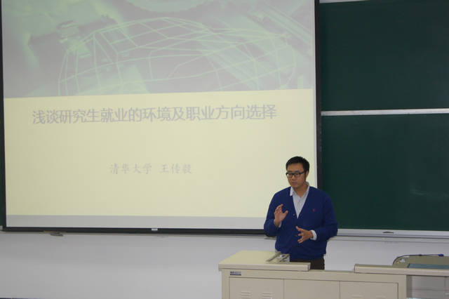 随后清华大学王传毅博士后、教育研究院教师刘进博士为来自全校各学院的100名参训学员做了专题报告,拉开了此次培训班培训课程的序幕。王传毅博士后以“浅谈研究生就业的环境及就业方向选择”为主题,结合自身研究从国际趋势与国内趋势两大角度分析了当今研究生就业的外部环境与宏观动态,并给同学们提出了“加强软技能培养”、增强专业精神和职业道德、培养口头和书面交际能力、培养团队精神和协作能力、培养批判性思维和解决问题的能力、培养道德水平和社会责任心等建议。