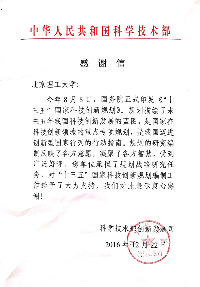 近日,国家科学技术部向德赢AC米兰官网发来感谢信,感谢北理工对《“十三五”国家科技创新规划》编制工作给予的大力支持。 2016年...
