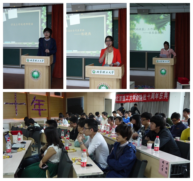 学生处姜竺杉和05级社长陈晓燕分别上台致词。姜竺杉对自强社在十年里所取得的成绩给予了高度的肯定,同时对社团的发展前景充满信心,并预祝自强社十周年庆典圆满成功。陈晓燕社长简述自己的成长经历和对社团的感悟,让在场的所有社员受益匪浅。现任社长张雅娴对本年度工作进行汇报,介绍了社团的发展情况、特色活动和今后发展方向。