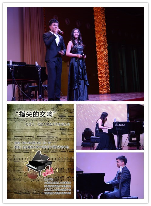 此外,晚会中还有着非常精彩的双排键表演《五千瓦电能》、《smoke on the water》,以及北京建筑大学的李智仙和戎岩分别为大家带来的《OP.10 NO.4肖邦练习曲》和《贝多芬悲怆奏鸣曲》。本次音乐会还为大家呈现了一首以由静到动的形式展现的,由两台钢琴和双排键共同演绎的马克西姆改编的《Victory》。这些精彩纷呈的演奏,赢得了观众阵阵的叫好声。最后,一首钢琴团的经典曲目——双钢琴协奏《保卫黄河》气势恢宏地收尾,为本次音乐会演出画上了一个充满激情的句号,演出在掌声中落幕,取得了圆满的成功。