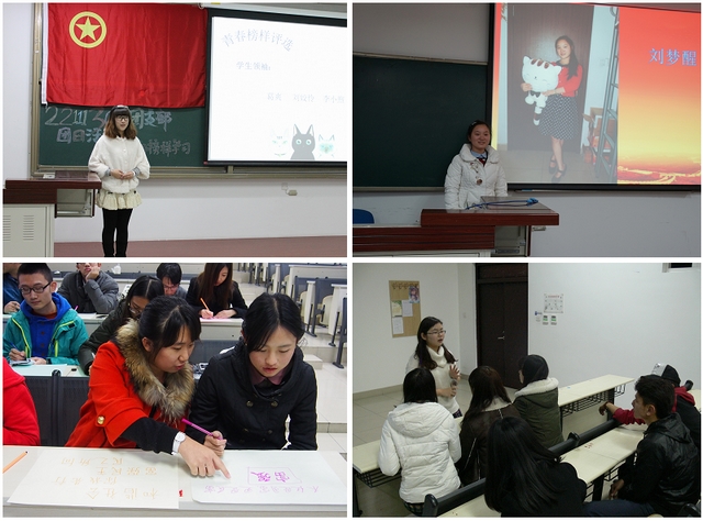 建立学院、团支部青春榜样库,发挥榜样示范作用。各团支部推选优秀的团员青年作为青春榜样,充实学院青春榜样库,以发挥榜样的示范激励作用。各团支部根据社会主义核心价值观基本内容和“勤学、修德、明辨、笃实”的要求,在科研创新、品学兼优、学生领袖、艺术体育等六大类中以民主投票方式推选青春榜样,号召团员青年学习青春榜样,发挥青春榜样的引领作用。
