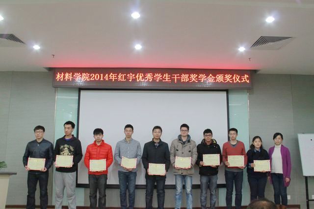 随后,颁发了材料学院2014年度红宇优秀学生干部奖学金。红宇优秀学生干部奖学金是由重庆红宇精密工业有限责任公司捐资设立,奖励学习态度端正,工作能力强,在学习、日常行为和科研工作中起模范带头作用的学生干部。刘艳老师为获得2014年度红宇优秀学生干部奖学金的付海东等10名同学颁发了荣誉证书。