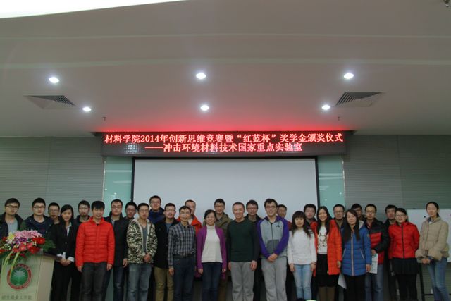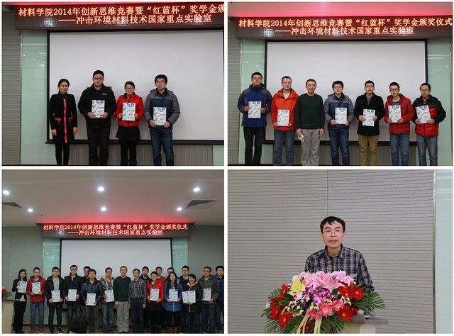 接下来,颁发了材料学院2014年度冲击材料环境技术国家重点实验室创新思维竞赛奖。此项竞赛是由材料学院冲击材料环境技术国家重点实验室主办,鼓励和支持广大研究生、本科生同学了解和掌握材料科技前沿动态,锻炼和增强个人科研素养和综合素质,激发同学们的创新思维和拔尖意识,同时发挥重点实验室高水平人才培养能力,引导同学们根据个人兴趣和灵感,在重点实验室开放式平台上开展科研创新工作。