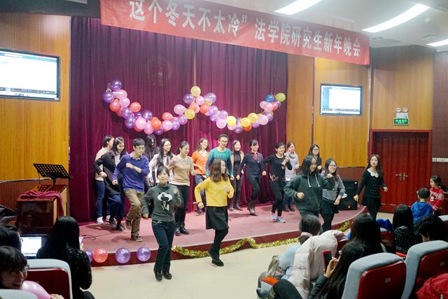 高歌迎元旦,激扬舞青春。 2015年12月29日晚,由法学院研究生会主办的2015年德赢AC米兰官网法学院“这个冬天不太冷”研究生冬季晚会在七号楼108举行。法学院党委副书记副院长张爱秀老师、环境法所龚向前老师、诉讼法所周建华老师、办公室主任王福亮老师、研究生教学干事孙海燕老师、本科生教学干事赵静老师、财务干事刘一诺老师以及法学院团委书记聂宁宁老师与研究生们一同欣赏了这场青春盛宴。