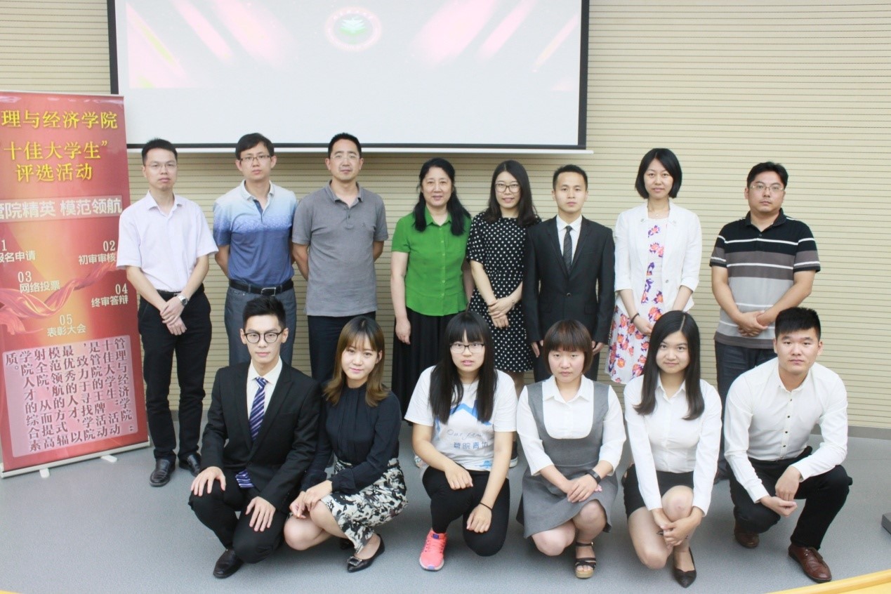 2016年4月,管理与经济学院正式启动以“管院精英,模范领航”为主题的2016年度“十佳大学生”评选活动。在4月初的申请阶段中,大家踊跃提交申请书,向着学院最高奖项努力。5月,活动进入初审阶段,“十佳大学生”评选委员会认真研究了申请人资料,完成了材料的预审与筛选,最终共有二十二位精英脱颖而出,通过初审最终晋级终审阶段。2016年6月初进行了“十佳大学生”的网络投票环节,学院在管理与经济学院网站与微信公众平台上展示了候选人资料并进行了线上投票。同学们在阅读了解候选人的事迹后,慎重地投出自己心目中认可的“十佳大学生”。