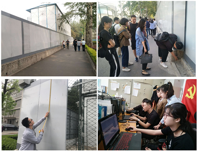 前期筹备阶段,设计学院辅导员欧阳哲带领2018届毕业生张家榜、毛艺轩、刘毓舜等同学对墙体进行了实地测量,搜集整理墙体具体数据与周边环境资料,绘制墙体示意图,并针对文化墙西高东低的形态,铁皮翘脚、不易保护等不利因素进行了一系列的实验与测试,为后期方案设计奠定了坚实基础。