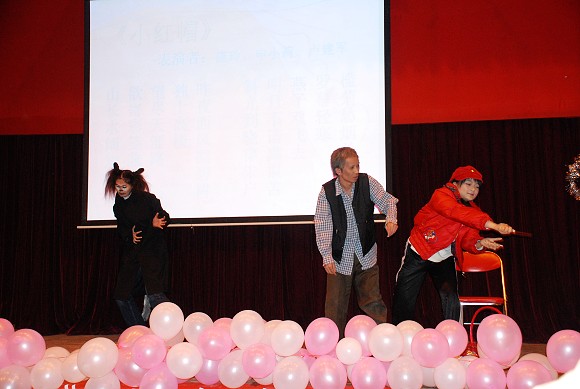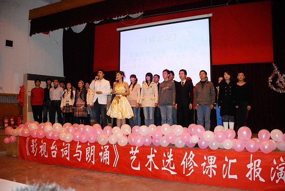 2007年12月13日晚七点整,在我校七号教学楼107报告厅,由艺术教育中心主办,艺术教育中心杨海滨主任总策划,艺术教育中心教师余凤霞老师指导的《影视台词与朗诵》艺术选修课程汇报演出隆重举行。人文学院副院长、艺术教育中心主任杨海滨老师,校新闻网编辑、高级摄影师段炼老师,以及艺术教育中心教师王颖、张乃凤、王倩,许晶,曲香竹出席了晚会。
