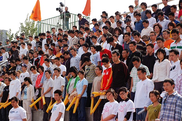 现场观众在为灾区遇难者默哀。