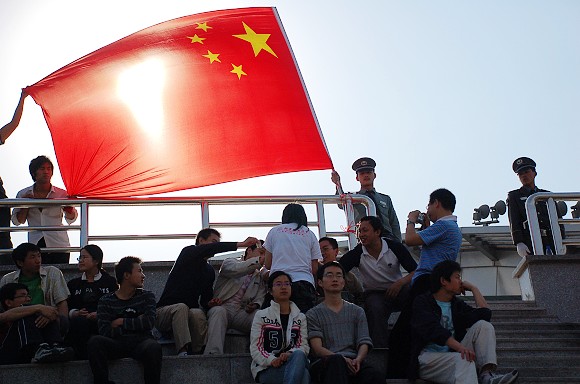 在鲜艳的五星红旗下,大家都尽自己所能为灾区祝福和祈祷。