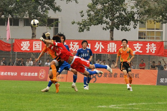 丢球后的北京爱国者队迅速展开反攻,大举压上造成对方后卫直接回传门将。但对方门将在禁区内玩火,头球停球不慎,只好将球解围出底线。