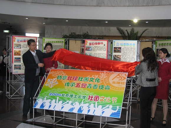 上午十点整,社团文化节揭幕仪式在中心教学楼一层大厅举行。校团委书记徐强老师和副书记衡靖老师出席,并为社团文化节展板上揭幕,宣告社团文化节的正式开始。