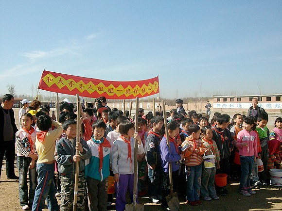 水碾屯完全小学是一所贫困学校,一座三层的教学楼外加一个不大的操场便构成了学生们的整个学习空间。初次步入,空旷的校园承载着孩子们稚嫩的笑声,虽在早春四月,却因这儿无遮无蔽,无树无花而让人觉得略显灼热。经过短暂的校方领导讲话,此次志愿植树活动便如火如荼的开始了。在老师的带领下,孩子们也加入了我们的队伍。“和大哥哥大姐姐一同种植心愿”——朴实而单纯。