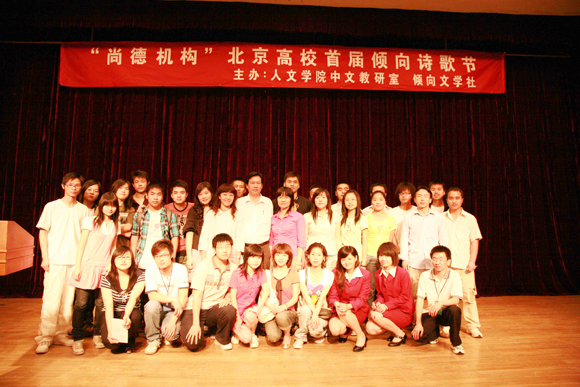 5月10日下午,由我校人文学院中文教研室和倾向文学社主办的“尚德机构”北京高校首届倾向诗歌节颁奖典礼在中心教学楼报告厅成功举办。我校设计与艺术学院党委书记杨海滨、校报、新闻网执行主编段炼、人文学院中文教研室主任姜楠副教授、《现代教育报》周刊部门主任张乔生、著名诗人蓝蓝、诗人安琪、青年诗人子禾等参加了颁奖典礼,到场的还有北京大学五四文学社、清华大学火石新诗社、北京师范大学五四文学社、中国农业大学挚友社、中央民族大学朱贝骨诗社、中央美术学院空白诗社等多个高校文学社团。