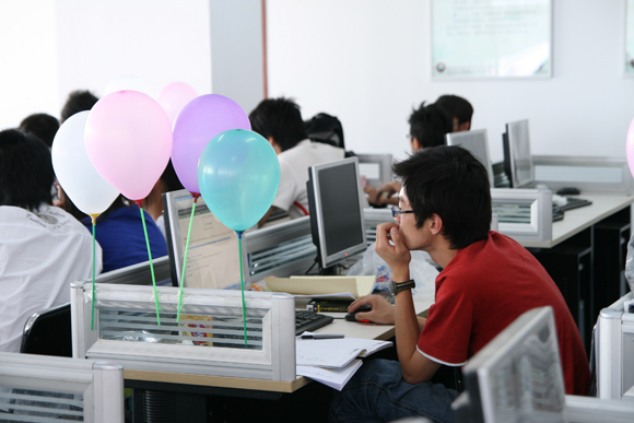 在6个小时的比赛过程中,参赛选手们都发挥了自己最好的水平。他们自备了水、面包等补充体力的食物,准备在6个小时中对自己的脑力和体力进行双重的挑战。比赛过程中,参赛队每做出一道题,都会给其队伍添加一个代表相应题目颜色的气球。借此给现场的选手提示出哪些题目较易攻克,更为比赛现场增添了十分轻松活跃的气氛。