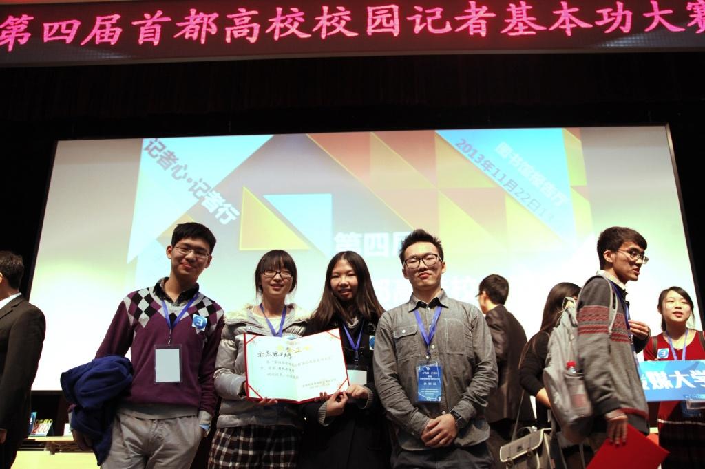 2013年11月23日下午,为了深入贯彻党的十八大精神和全国宣传工作会议精神,提高高校记者的基本能力和基本素质,培养高校记者的思维能力和应变能力,第四届首都高校校园记者“记者心•记者行”基本功大赛在对外经贸大学图书馆拉开了帷幕,来自中国传媒大学、北京师范大学、中国政法大学等15所首都高校应邀参加了此次比赛。我校大学生记者团记者喻典(2011级材料学院)、胡金璐(2012级外国语学院)、朱彧良(2012级机械与车辆学院)、高月桐(2012级光电学院)在党委宣传部指导老师杨扬的带领下首次参加首都高校记者基本功大赛,并荣获“团体二等奖”。