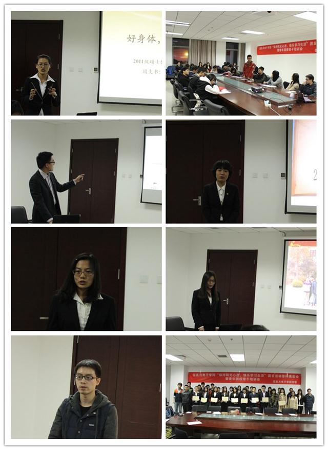 各团支部在活动结束后向学院团委提交了新闻稿、座谈记录和活动照片等材料。为表彰表现突出的团支部,树立典型,加强引导示范作用,信息与电子学院团委从团日活动创意、实施效果、活动质量、总结材料质量等多个方面对各团支部开展的团日活动进行考核评比,并择优予以表彰。11月25日,05411102团支部的“阳光运动 精彩未来”、05111002团支部的“传递健康,分享快乐,憧憬未来,感悟人生”、11硕信号二团支部的“好身体,好工作”、13硕电医团支部的“坚定崇高信仰,保持阳光心态”等8个团日活动在学院团日活动答辩表彰会上进行了答辩,并由学院各年级的团支书担任评委进行了评分。最终,05111002团支部以“体育技能一帮一”的形式、集体座谈会的深刻教育意义和附加的放飞纸飞机的创意环节获得好评,荣膺学院一等奖。13硕电医团支部和05411102团支部荣获二等奖,13硕微电团支部、11硕信号二团支部和05921001团支部荣获三等奖,13硕通信一团支部和13硕信号二团支部荣获优秀奖。
