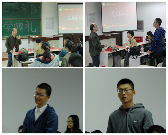 接下来进行的是“院长面对面活动”。来自于德语系的魏卜堃同学提出了如何坚守本心的问题,陈大明书记指出学会创新,学会正心。而随后李一骄同学则提出了如何发挥外语学习者的力量,为社会贡献出自己的一份力,陈大明书记从外语学习者的未来与社会现状作出解释,详实深刻。肖昱同学从读书的角度出发,提出如何将学习与读书结合的问题,陈大明书记指出读书的目的是了解世界、更好地理解自己。有的同学提出如何正确面对理工科大学外语学院男生的尴尬地位,吴文君老师以马云、李肇星和吴建民等为例子,勉励大家只要努力学习专业,在理工科大学里一样可以找到属于自己的舞台,活出精彩。西班牙专业的同学则提出如何尽快掌握西语的发音问题,西语系负责人曾艳老师以自己的亲身经历勉励学生要有耐心、韧劲和恒心。整个现场气氛热烈、活跃。