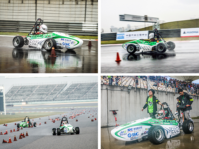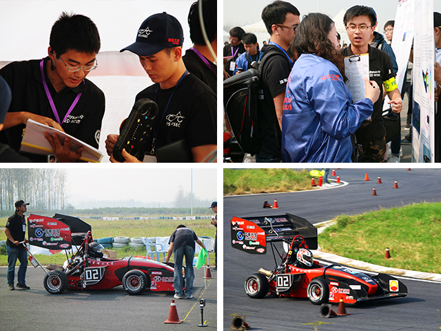 虽然首个进入动态项目,却略遇不顺。11月的上海,阴雨绵绵,赛程中一直伴随着小雨,湿滑的赛道不仅影响赛车的性能发挥,也给赛车手的驾驶增加危险性,带给车队巨大的挑战。而此时已有数辆赛车因雨水渗透引发故障,赛车动力中断或无法启动,导致退赛。但我校经验丰富的赛车手和银鲨稳定的赛道表现,在最后的雨战中以几乎零失误(包括脱离赛道、撞桩筒等)顺利完成了21公里的耐久性测试。加之轻量化的赛车设计,也让银鲨赛车在经济性测试中得到了满分。