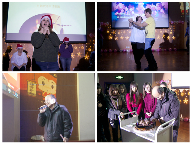第一环节到此结束,可爱的外籍教师随后进行中场表演。外教们用默剧形式演绎新年歌曲,现场反响热烈,掌声连连。接着,党委书记陈大明深情演绎了一首《氧气》,曲调温和,时而转音,可谓一曲震惊四座,全场同学掌声雷动。随着一个生日蛋糕的缓缓推出,晚会进入高潮:为所有12月20日后出生的外国语学院的同学集体庆生。生日歌唱起,陈书记现场给大家分蛋糕,其乐融融,宛如一家,带给大家无限的温暖与感动。