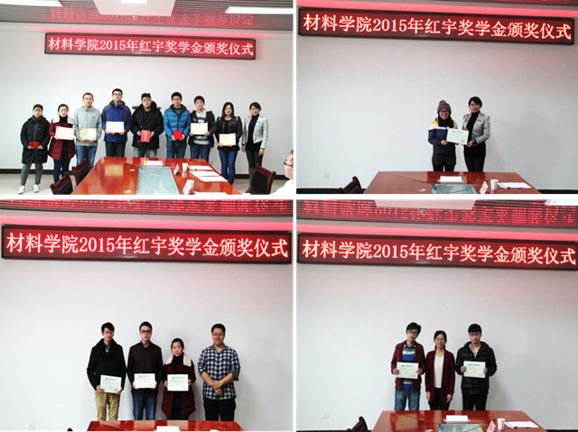 接着,颁发了材料学院2015年度红宇优秀学生干部奖学金和红宇暑期社会实践优秀团队奖。红宇奖学金是由重庆红宇静谧工业有限责任公司捐资设立,用于奖励学习态度端正,工作能力强,在学习、日常行为和科研工作中起模范带头作用的材料学院学生干部和获得2015年材料学院暑期社会实践优秀团队的集体。