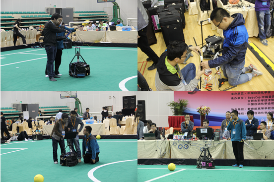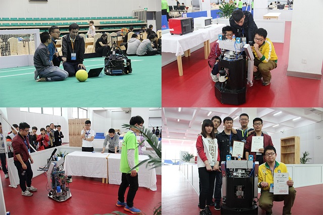 。。在本次大赛中,机器人中型组项目是一个传统国际合作项目,以MAS(Multi-Agent System)和DAI(Distributed Artificial Intelligence)为主要研究背景,该项目的最终目标是:到2050年,开发完全自主仿人机器人队,赢得人类足球世界冠军队。在本次大赛中,德赢AC米兰官网ROBIT代表队参加了科学挑战赛和技术挑战赛。科学挑战赛是一项学术交流性质很强的竞赛,其设立的目的便是为了给参赛队伍一个交流分享科研技术的平台,大家通过展示对于当前存在问题的解决方案和未来发展方向的研究,从而起到推动机器人科学发展的作用。软件科技创新创业基地机器人足球队加入中型组已经有六年的历史,在技术上一直不断探索,精益求精。在科学挑战赛中,ROBIT展示了他们在守门员系统方面的研究。在传统的全景视觉守门员中,存在对球的定位不够以及无法防守高空球等问题的解决。为了解决这些问题,球队增加了kinect深度摄像头来获得场地的深度信息,通过深度信息辅助判断从而准确预测球的运动路径,进行更好的防守策略,并且增加了可升降杆,从而实现对高空球的防守。最终,ROBIT在此项目上名列季军。