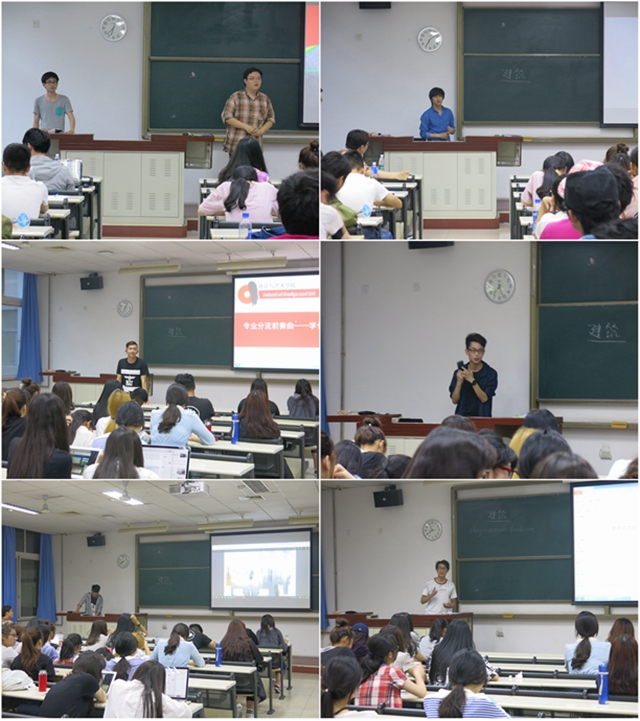 分享会筹备前期,学院借助微信公众平台对2015级学生进行了专业分流相关问题的征集,收到学生问题49个,经学院整理编辑有效问题共计25个,内容涵盖专业细节、专业前景、教学管理三个方面。环境艺术专业的杨德加、芦天玄、张博文三位同学分享了环境艺术系相关课程的学习经验及学习内容。工业设计专业的陆炎凯、张宝文、张严三位同学结合亲身经历,向学弟学妹分享学习心得,介绍所学专业对学生的能力要求以及相关就业方向。郭瀚泽同学介绍了视觉传达专业的主要课程以及对手绘能力的要求,并分享了部分视觉传达的优秀作品。最后,文化遗产专业的朱彦蒙、林婷娟介绍了文遗专业与其他专业的区别,分享了专业学习心得并鼓励大家多探索、勤思考。