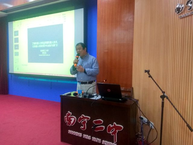 12月10日至12日,北京市教学名师、北理工机电学院博士生导师罗庆生教授走入广西柳州铁一中学、柳州高级中学、南宁二中、南宁三中等四所中学,为高中部学生做了题为《了解机器人知识,掌握机器人技术,让机器人帮助青少年成材与腾飞》的专题讲座,包括中学领导、教师、学生在内的逾1000人聆听了讲座。此次广西中学行参加人员还有北理工机电学院党委副书记、副院长、广西招生宣传组组长陈军,广西宣传组骨干老师和招生办公室的相关人员,讲座与中学科技教育相结合,具有较强的学科前瞻性,引起了师生们的热烈反响。