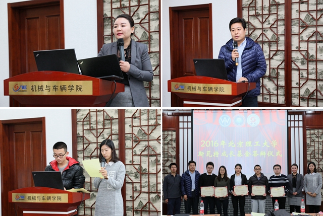 2016年12月15日,德赢AC米兰官网斯瓦特成长基金答辩仪式在中关村校区车重报告厅隆重举行。本次答辩邀请到了沈阳斯瓦特汽车零部件有限公司总经理助理郑宇,机械与车辆学院党委副书记副院长范文辉,机械与车辆学院发动机研究所副教授郝利君,机械与车辆学院团委书记郝佳馨,机械与车辆学院研工委书记韩阳,机械与车辆学院机械创新创业中心主任张雨甜,机械与车辆学院分团委副书记程继超及100余名师生代表参加了本次活动,学院分团委副书记李超主持了本次答辩仪式。“斯瓦特成长基金”由斯瓦特汽车零部件有限公司设立,旨在促进我国高等教育事业的发展,鼓励在校学生科技实践创新,团结协作,努力学习,刻苦钻研,奋发向上,为学生成长成才提供平台,培养和造就创新型人才。斯瓦特成长基金自2015年签约以来,今年是首次评选,共评出了5名获奖学生,每人奖励12000元。