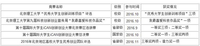 2016年11月,“仿生老鹰扑翼式飞行器”及 “汽车落水情况下协助逃生系统”团队在北京市教育委员会举办的2016年北京地区高校大学生优秀创业团队评选中表现优异,荣获“三等奖”,被授予“北京地区高校大学生优秀创业团队”称号;“让世界充满爱(手语翻译大师)”团队获得“潜力奖”。同时三支队伍受邀作为德赢AC米兰官网代表团队参加了2016年12月3日-4日期间在北京工业大学耿丹学院举行的第五届大学生科技创新作品与专利成果展示推介会。会上三组作品受到了参会专家及企业代表的一致好评,并提出了众多宝贵意见。