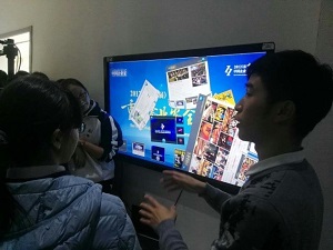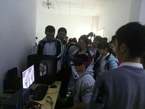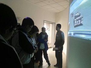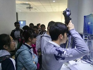 活动中向同学们展示了世界前沿的虚拟增强现实相关的各项技术。在平视显示系统前,工作人员一边引导同学们观看叠加在全息透镜上的数字仪表信息,一边为大家讲述该系统从军机专用到而今普及进入汽车导航的跨越发展。在智能多点触控屏前,工作人员讲述了在普通LED大屏上加载多点触控识别的机理以及其优势。在观看军演沙盘投影系统演示和汽车自由曲面投影系统演示时,炫彩有趣的动画效果令同学们驻足,大家纷纷拿出手机拍摄,记录下这美妙的数字画面。同学们还观看了虚拟现实立体观影设备带来的震撼3D效果影片,体验了增强现实显示头盔和人机交互系统,展厅里不时传出同学们的惊呼,这些平日里只有在电影里才能见识到的黑科技,今天竟然就出现在了自己眼前。