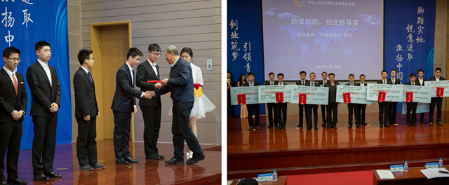 苗圩部长为特等奖获奖团队(个人)颁奖。财政部、工信部相关司局以及部分部属高校负责同志为其它奖项获奖学生代表颁奖。
