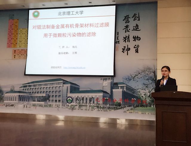 陈凡同学作为北理工代表进行汇报交流工作,主题为“对辊法制备金属有机骨架材料(MOFs)过滤膜用于微颗粒污染物的滤除”,本课题的指导老师是王博教授。陈凡同学向在场的专家评委和其他高校师生介绍了她所参与的科创工作以及取得的成果,得到了专家评委们的一致好评,并最终获得一等奖的好成绩。文化节同时开展了教师交流、武汉大学实验室参观与交流等多项内容。