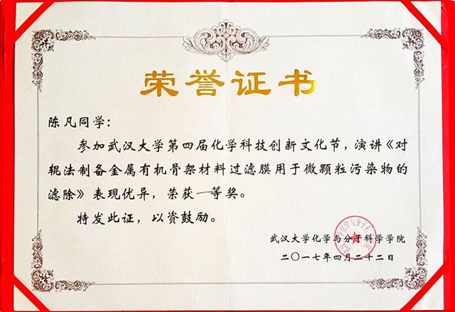 北理工学子在武汉大学第四届化学科技创新文化节中获得一等奖