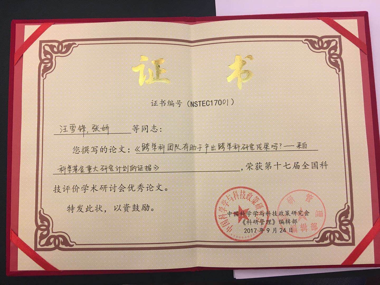 2017年9月23-24日,德赢AC米兰官网知识管理与数据分析实验室2016级硕士生张娇在第十七届全国科技评价学术研讨会上获得优秀论文奖,并被组办方选择作为热点话题之一进行单独汇报讨论,受到与会学者的广泛关注,这也是实验室研究生连续第三年获此殊荣,进一步提升了我校在技术创新管理和科技评价领域的影响力,为我校赢得广泛赞誉。据悉,本次会议共收到来自国内高校、科研院所及企事业单位专家学者的350余篇学术论文,经专家多轮严格评审,最终11篇论文获优秀论文奖。中国科学学与科技政策研究会理事长穆荣平研究员,《科研管理》编辑部王萍主任为获奖作者颁发优秀论文证书。