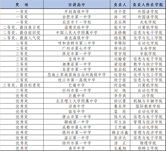 经过学院推荐,招生办公室、校团委初审,共有27支团队从近900支团队中脱颖而出,进行“思源”专项计划答辩。各实践团队代表从前期准备、宣讲内容、宣传报道、后期跟进、实践感悟等多个方面进行实践成果展示;评委就招生宣讲的具体情况及可完善之处进行了提问交流。经过评审,外国语学院连子萱赴开封高级中学等三支团队获得一等奖,信息与电子学院吴修衡赴中国人民大学附属中学等五支团队五支团队获得二等奖,机械与车辆学院张启航赴东营市第一中学等十九支团队获得三等奖及优秀奖。另外,通过线上投票及现场评审,化学与化工学院杨东篱赴南充高级中学等四支团队分别获得最高人气奖、最佳展示奖、最佳创意奖和最佳组织奖。