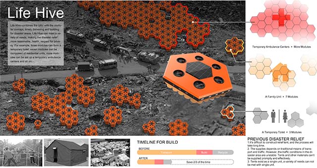 “LIFE HIVE”(蜂巢救灾无人机系统)的设计灵感来源于对灾区救灾过程的思考和人文关怀。Life Hive创新的将无人机应用于建筑方面,利用模块化无人机灵活的飞行优势,搭载能力实现灾区帐篷的快速搭建,有效提高救灾质量。传统的救灾方式中,灾区的帐篷的补给依赖于传统的运输工具以及路况。但灾区的路况恶劣且十分不稳定,帐篷经常得不到及时有效的供给。同时传统的帐篷搭建较为繁琐,耗时较长。同时传统的帐篷均为大通铺的形式,无法实现对个人隐私的尊重。此外,传统的帐篷的设计采用单体的设计想法,并不能满足如医疗站、厕所、家庭居住等不同大小、功能的空间需求。